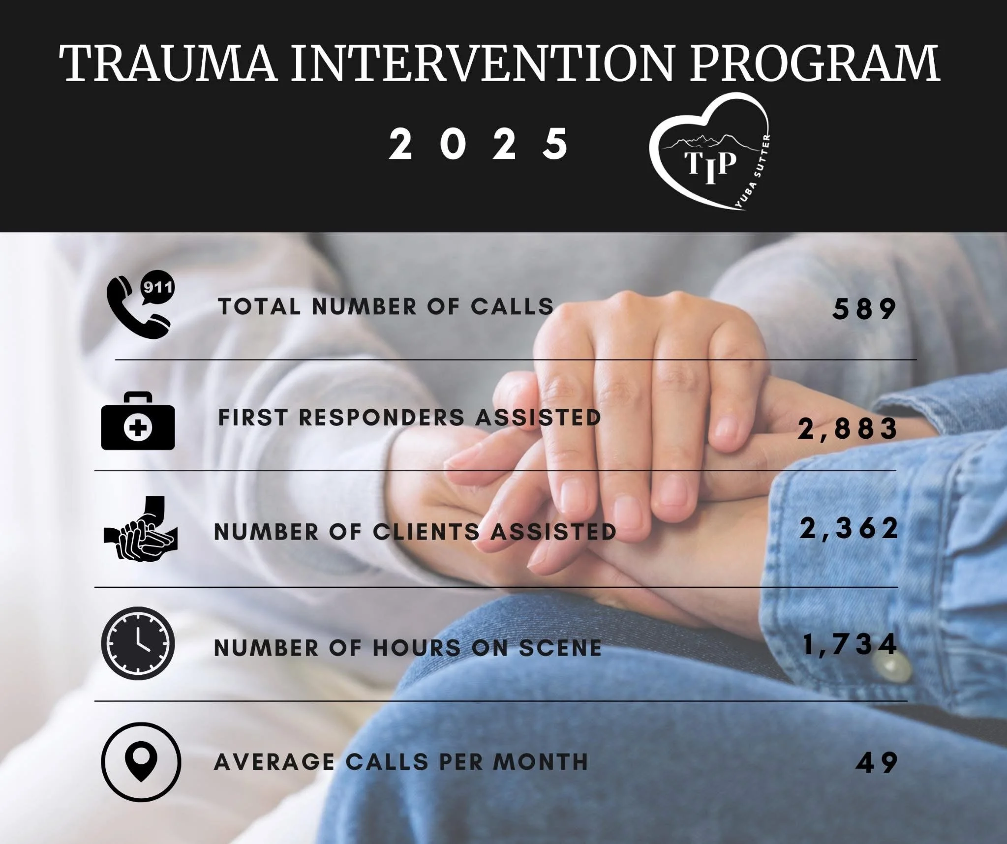 TIP Yuba-Sutter is a Chapter of Trauma Intervention Programs Inc (tipnational.org) which was founded in San Diego County in 1985. There are currently 13 regional chapters in the nation serving over 250 cities.